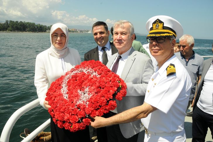 Kutlamaya bir teknede katılan ilçe protokolü, denize çelenk bıraktı ve şehit denizciler için dua edildi.