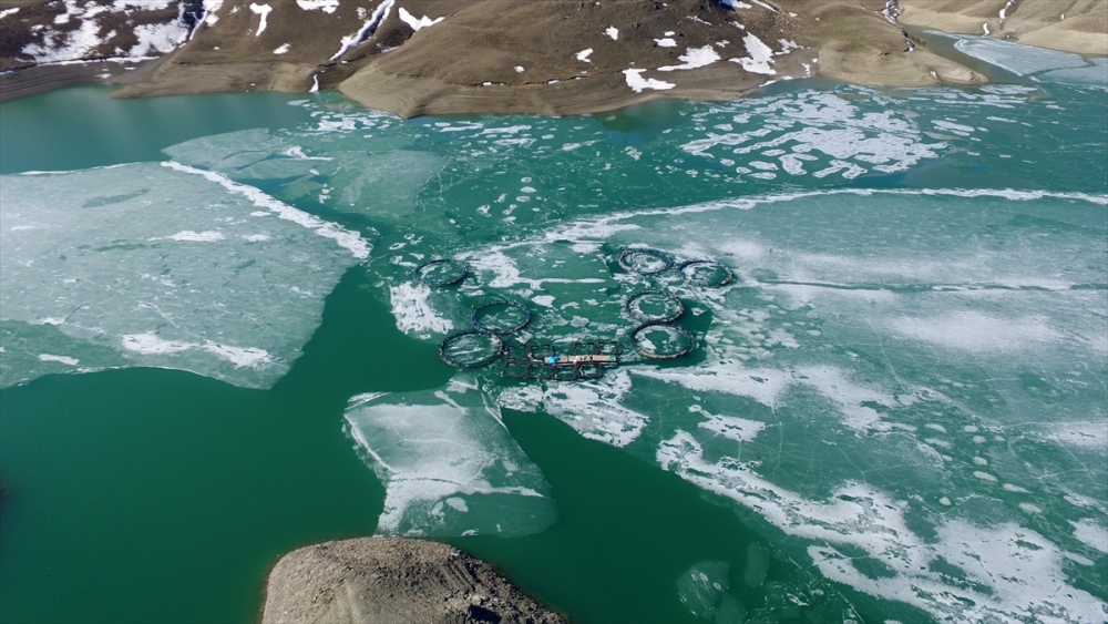 Gürpınar ilçesindeki 105 milyon metreküp su kapasiteli göl, yaklaşık 4 ay önce dondu. Havaların ısınmasıyla buzları çözülmeye başlayan göl, havadan görüntülendi.
